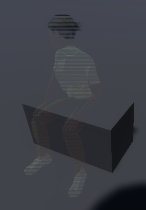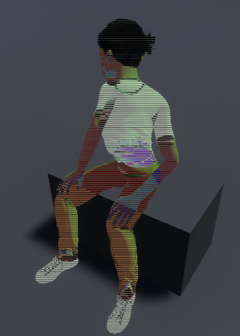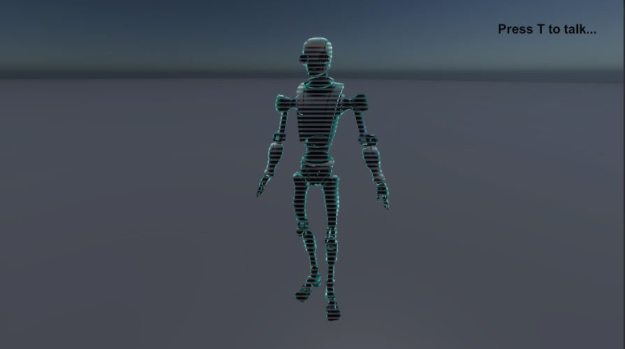 Zoals hierboven te zien is, was hij in eerste instantie te transparant waardoor je het hologram amper kon zien. Ik zette er een extra mulitply node bij zodat de texture iets feller is. Nu is het een stuk beter maar glitcht hij wel een beetje, maar dat is misschien niet eens zo erg aangezien hologrammen altijd wel een beetje glitchy zijn. Het kan ook aan dit specifieke model liggen aangezien hij het op andere objecten wel goed doet en het is maar een tijdelijk model. (Zie robot hieronder voor een beter voorbeeld).