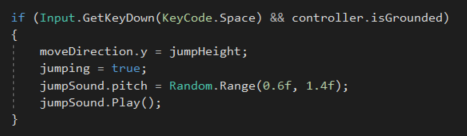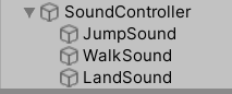 Vervolgens ben ik verder gegaan met een stukje sound. Ik heb een Soundmanager in de scene geplaatst waar alle sfx onder staan (zie rechterplaatje). Dit is nu voorlopig gedaan voor een walk sound, jump sound en landing sound. Ook heb ik het zo gemaakt dat de geluiden elke keer een net iets andere pitch hebben zodat het niet elke keer precies hetzelfde klinkt. Hieronder is het voorbeeld te zien voor het geluid bij springen.